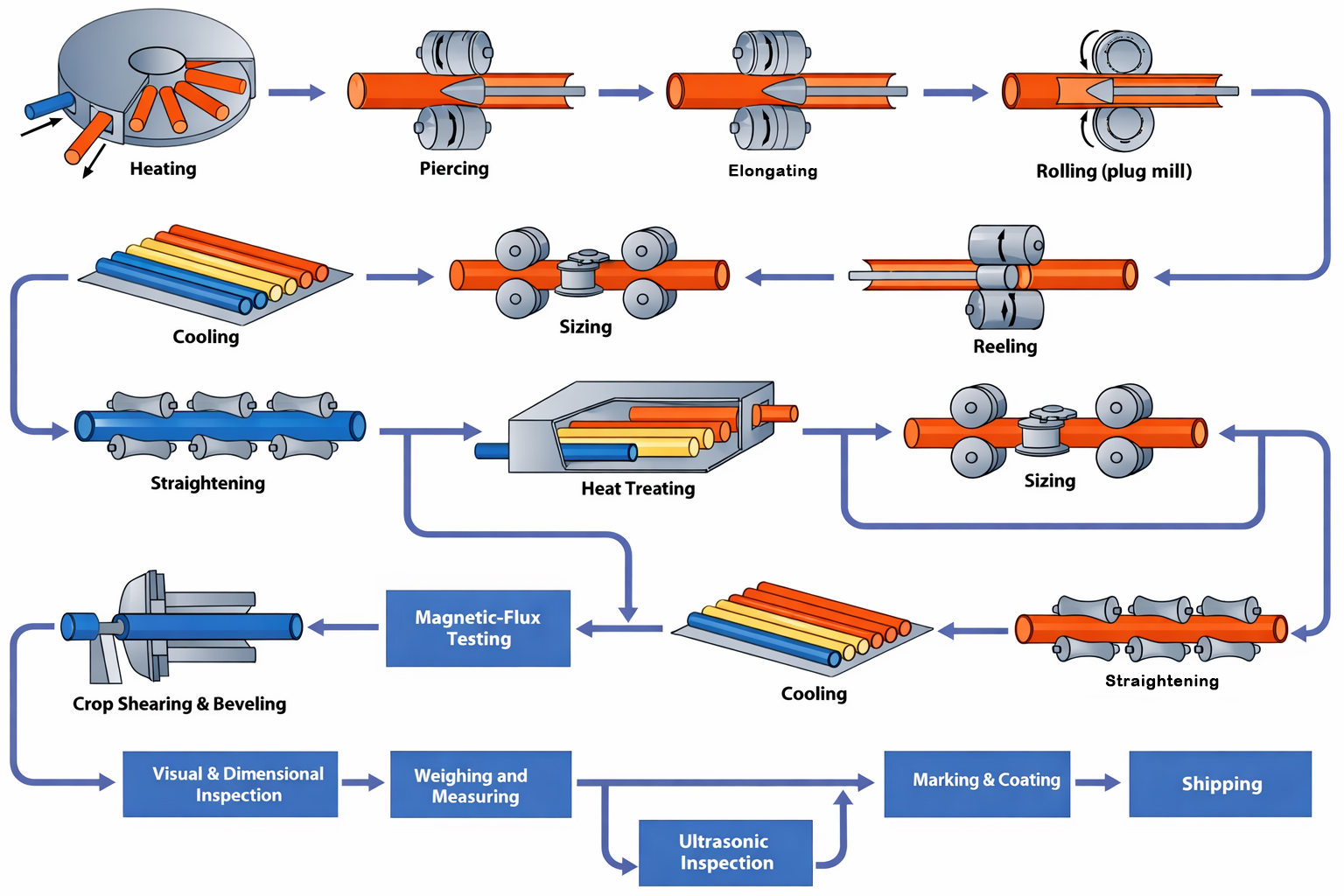 Rolled Round Billets – Examination – Cut Off – Heating – Piercing – Elongation – Slight Tension Reducing – Straightening – Corp End Cutting Off – Visual Inspection – NDT – Hydro-static Test – Ends Procession – Product Inspection – Painting and Marking – Packing – Warehousing