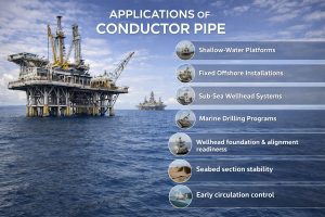 Large-diameter 20″–36″ conductor pipe and risers with quick, BTC, and premium connections for offshore oil & gas well foundations.