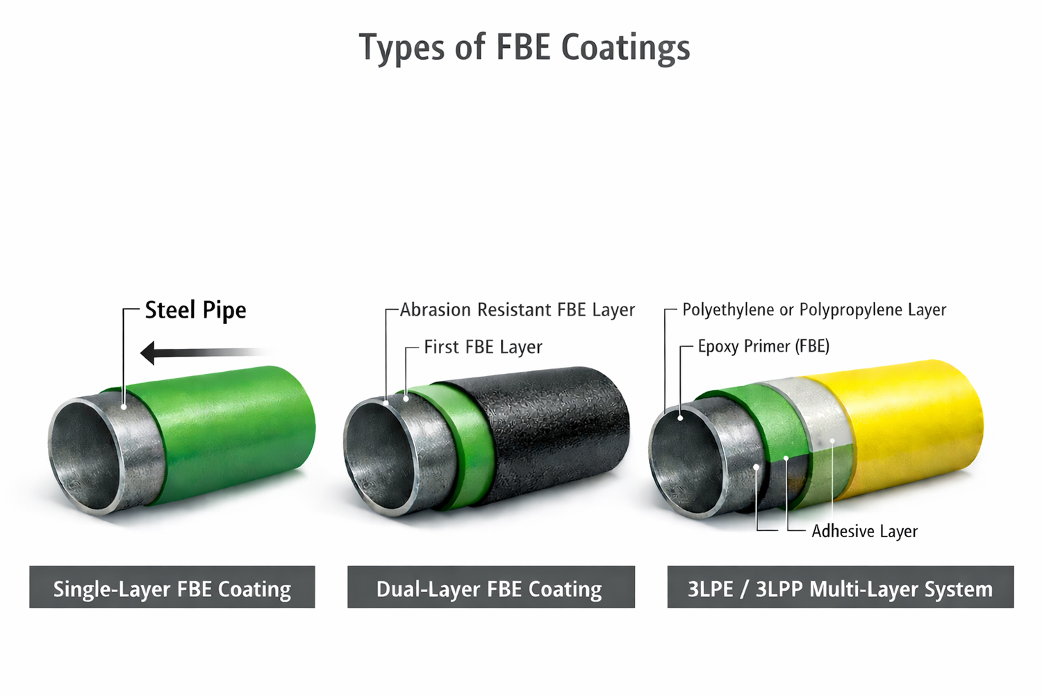 System options: single-layer FBE, dual-layer abrasion-resistant FBE, or 3LPE/3LPP (FBE as epoxy primer), plus epoxy paint boundaries for field joints and localized repairs.