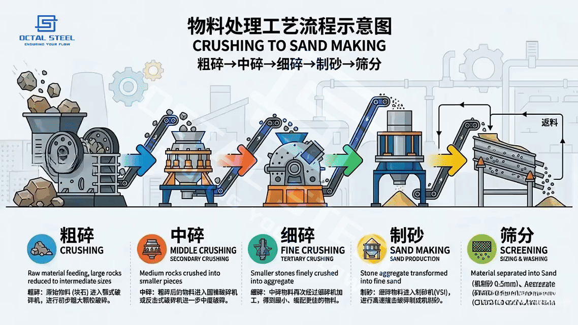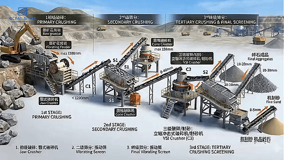 As illustrated in the operational flowsheets above—whether analyzing a comprehensive manufactured sand (M-Sand) circuit or a conventional three-stage hard rock crushing layout—the jaw crusher consistently occupies the initial stage of the material processing line.