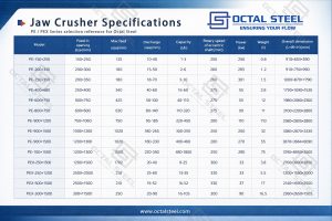 The Jaw Crusher specification range covers both smaller and larger jaw crusher models for different feed sizes, discharge requirements, and output targets. In practical selection, the key points are the feed opening, maximum feed size, discharge adjustment range, capacity, and installed power, since these parameters determine whether the crusher matches the intended primary crushing duty.