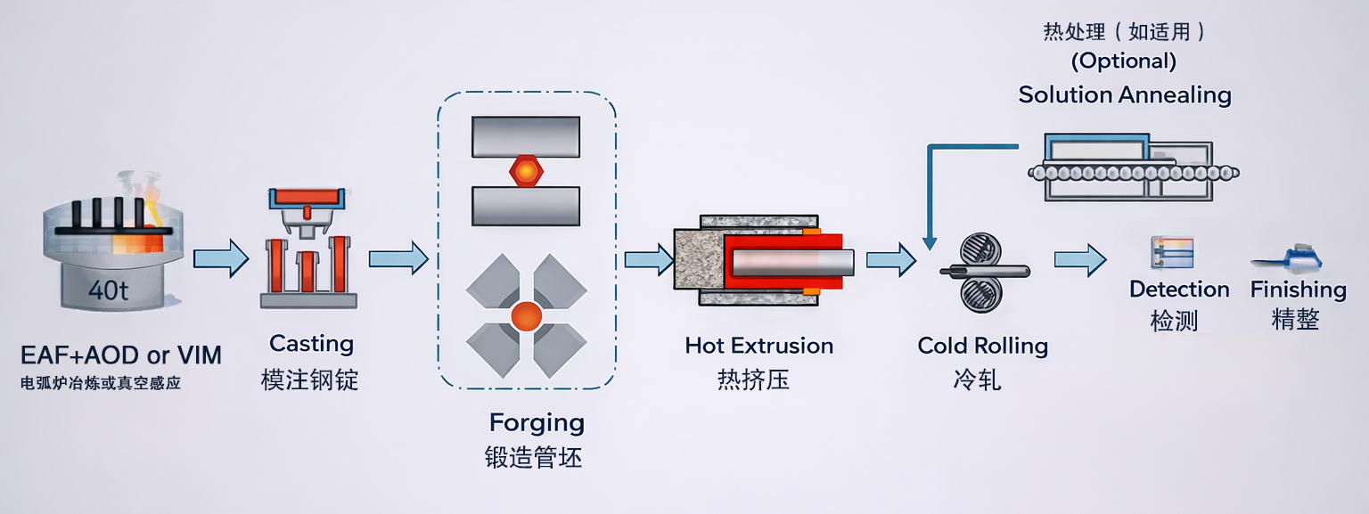 | S31803 | 65 | SA | EAF+AOD+LF→IC→ESR (If required)→ Forging Billet→ Hot extrusion/Hot piercing→ Cold pilgering/Cold drawing→ Solution annealing→ Inspection |