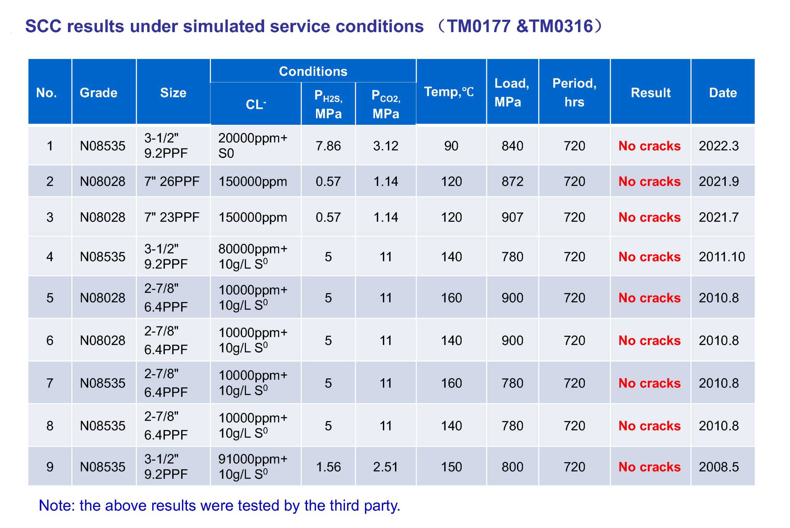 Examples from the supplied test set include N08535 at 3-1/2″ 9.2 PPF under 20,000 ppm+ chloride condition at 90°C and 840 MPa for 720 hours with no cracks, and N08028 at 7″ 26 PPF under 150,000 ppm chloride condition at 120°C and 872 MPa for 720 hours with no cracks. The same data set also shows N08028 at 2-7/8″ 6.4 PPF tested at 160°C and 900 MPa for 720 hours with no cracks, and N08535 at 2-7/8″ 6.4 PPF tested at 160°C and 780 MPa for 720 hours with no cracks.