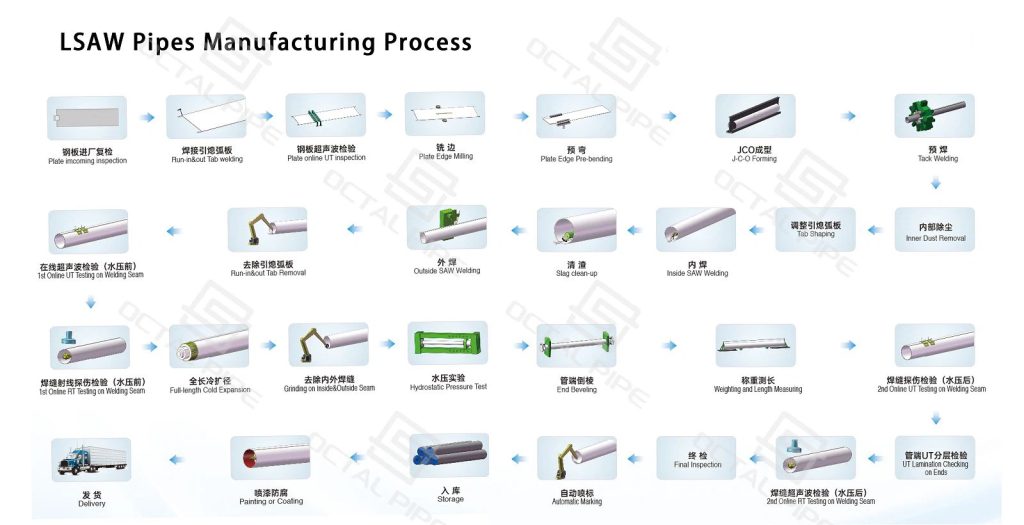 LSAW pipes from Octal Steel are crafted from premium hot-rolled steel plates, with compositions fine-tuned for excellent weldability, ductility, and resistance to corrosion and fatigue.